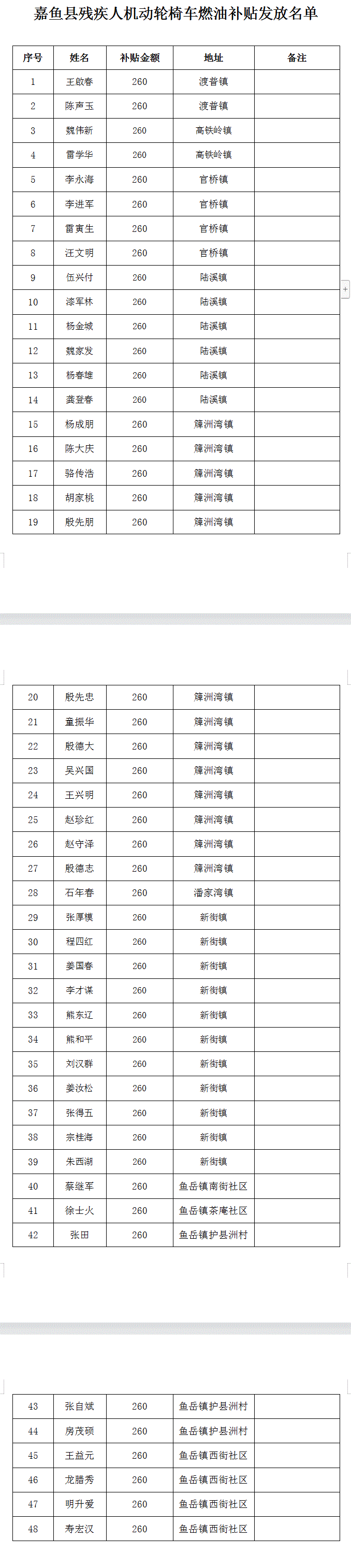 附件:嘉鱼县残疾人机动轮椅车燃油补贴发放名单