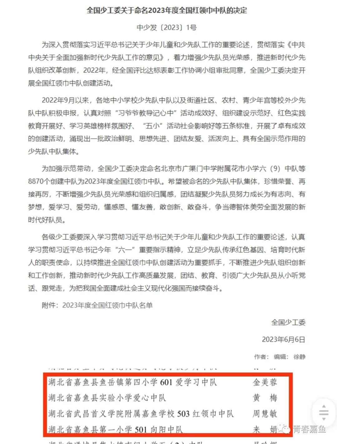 近日,全国少工委发布《关于命名2023年度全国红领巾中队的决定》,其中嘉鱼县实验小学爱心中队、嘉鱼县鱼岳镇第四小学601爱学习中队、武昌首义学院附属嘉鱼学校503中队、嘉鱼县第一小学501向阳中队等4个少先队中队被命名为2023年度全国红领巾中队。