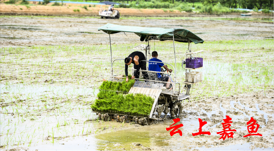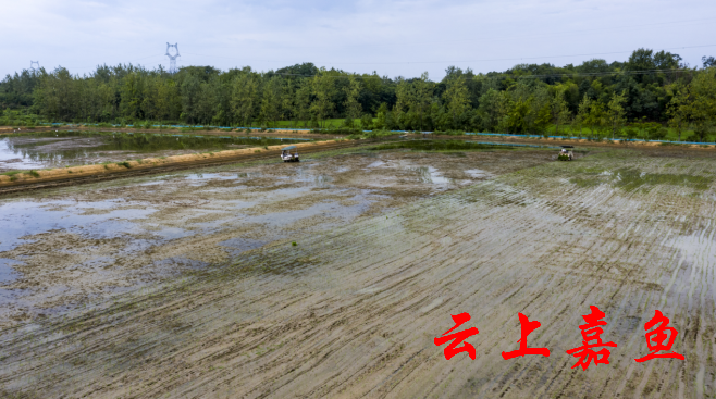 云上嘉鱼报道(全媒体记者雷平 通讯员蒋梦云)7月20日,在高铁岭镇陆水村1000亩稻虾基地里,机声隆隆,农民们正忙着插秧,不远处还有成群的白鹭飞过,田园风光无限好。