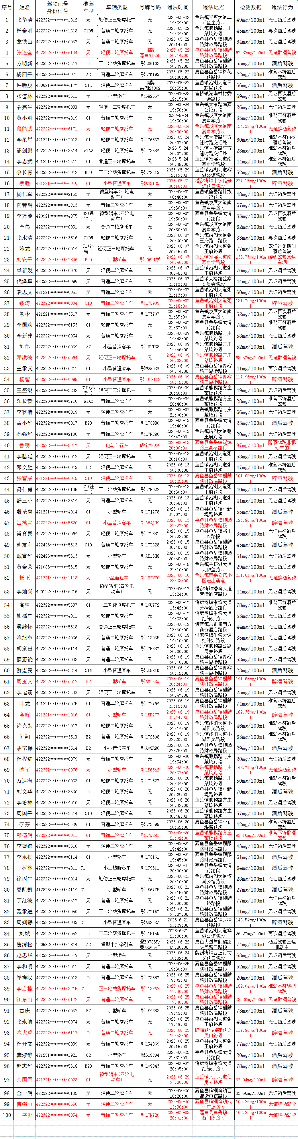 嘉鱼县公安局交警大队查处酒醉驾行动曝光台2023年第7期。下列人员因酒醉驾违法犯罪行为被公安机关依法查处,被处以暂扣驾驶证6个月和吊销驾驶证,5年内不能重新申领等处罚。驾驶证暂扣和吊销期间不得驾驶机动车,望广大居民对下列人员进行监督,一旦发现下列违法人员有驾驶机动车行为的请立即向公安机关举报。对举报违法行为经公安机关查实的,给予举报人奖励500元。举报电话:0715-6351271。