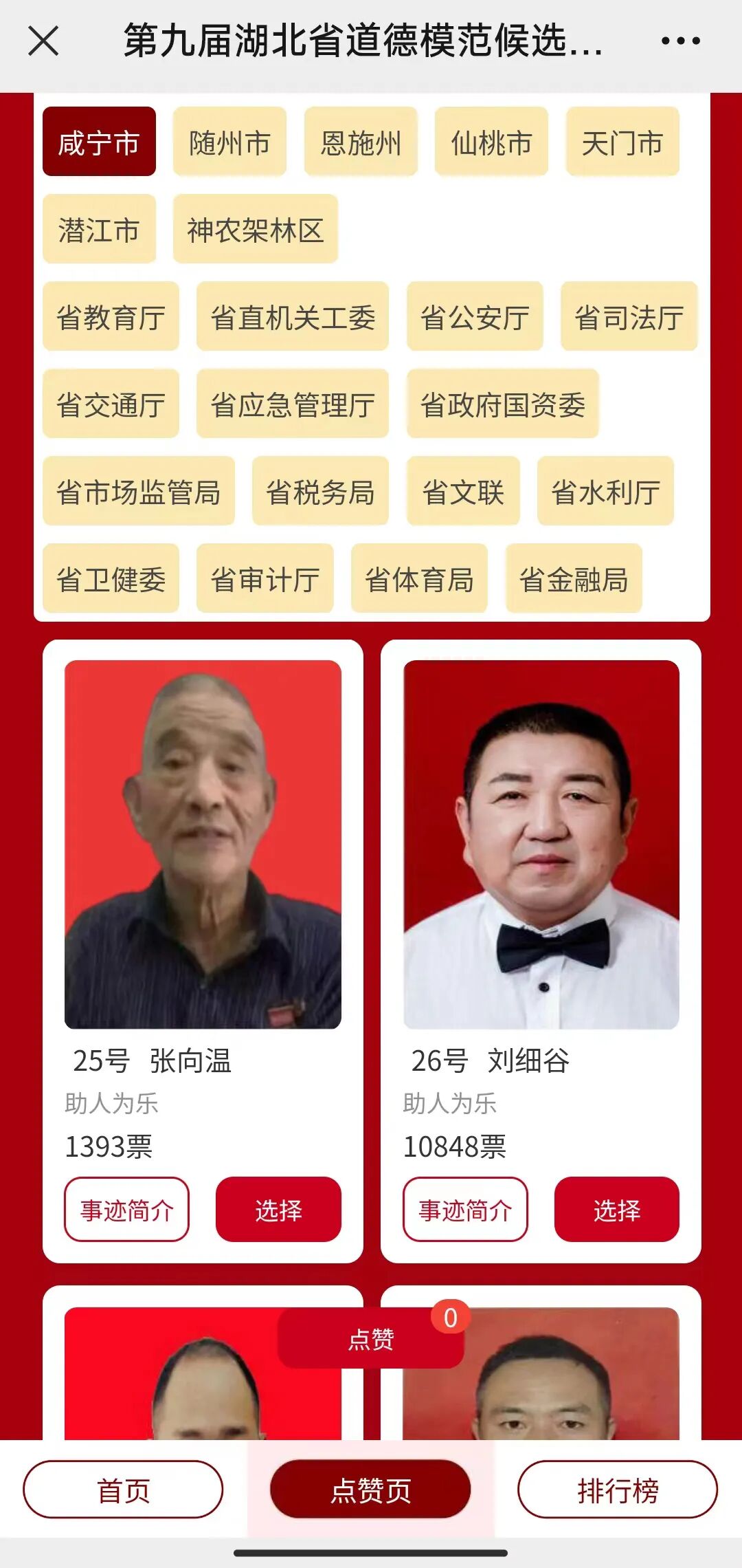 按照第九届湖北省道德模范评选表彰活动的通知要求,经初审,有193人(组)符合推荐标准,即日起在“文明湖北”微信号上开设专栏,方便社会各界对候选人(排名不分先后)进行点赞评议。
