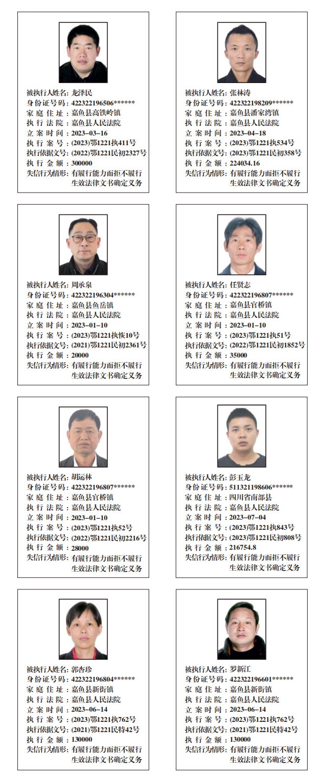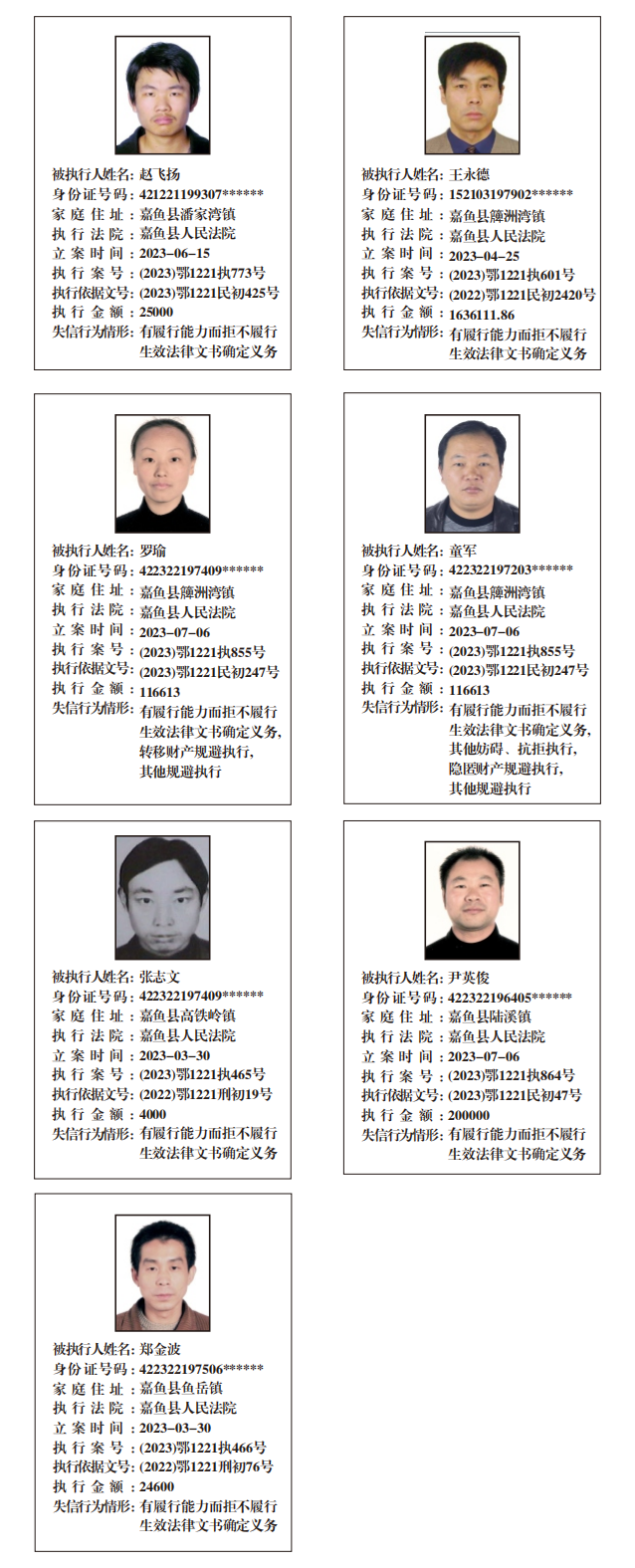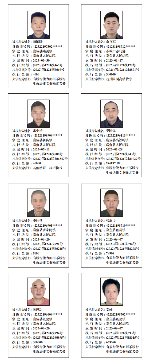 为维护司法权威,督促被执行人自觉履行生效法律文书确定的义务,弘扬诚实守信的社会风尚,推进“法治嘉鱼”、“诚信嘉鱼”建设,根据《中华人民共和国民事诉讼法》和《最高人民法院关于公布失信被执行人名单信息的若干规定》的规定,现对嘉鱼法院范围内未自觉履行生效法律文书确定义务的第一批典型失信被执行人名单予以曝光。 请社会公众在与下列失信被执行人交往中持谨慎态度,规避交易风险,并对被曝光的失信被执行人财产线索进行举报。 举报电话:0715-6359361。