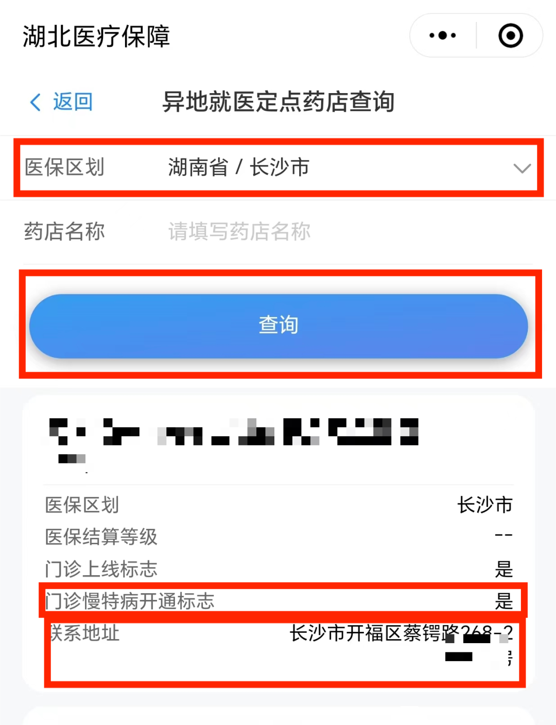 选择您想要查询的城市,点击【查询】,系统会显示异地定点药店的详细信息。