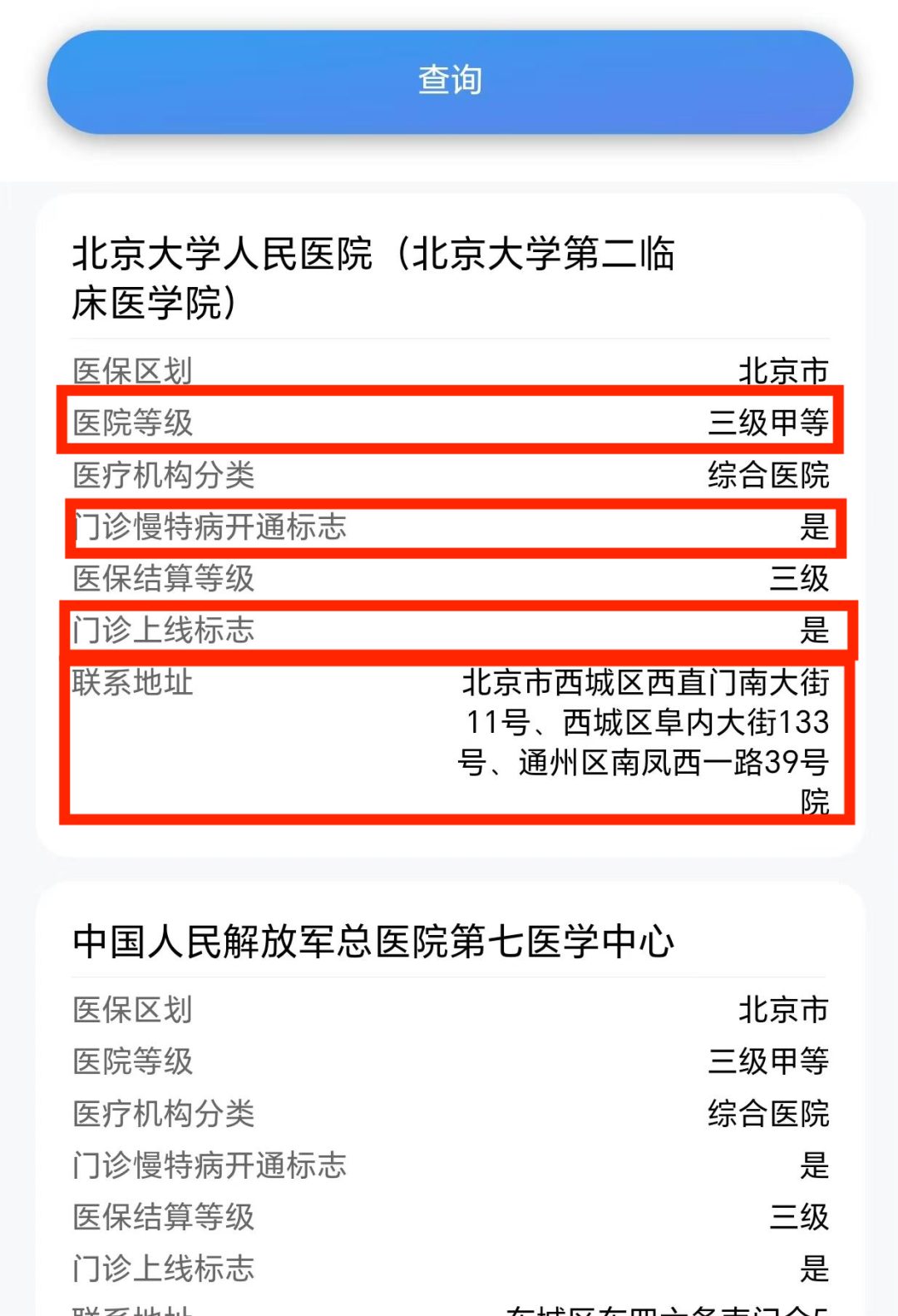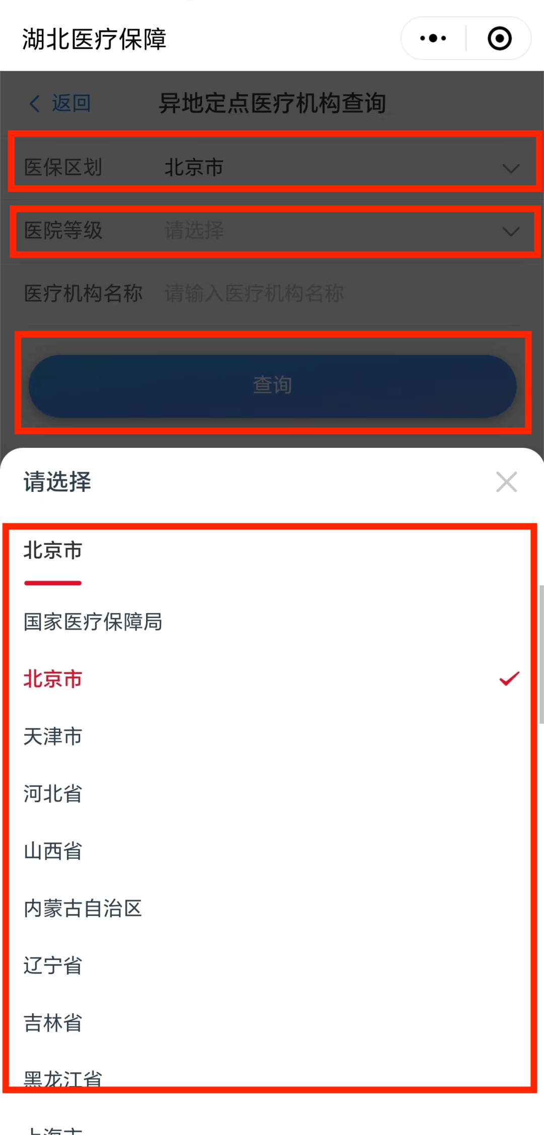 选择您想要查询的城市、医院等级,点击【查询】。