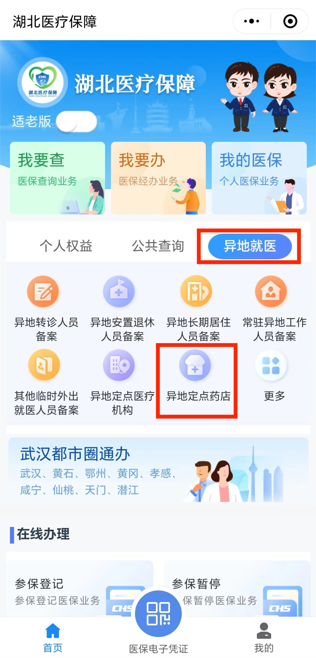 进入小程序首页,点击【异地就医】—【异地定点药店】。
