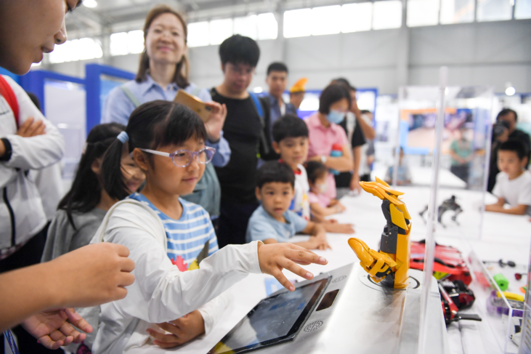 9月17日,在全国科普日北京主场活动展区,小朋友体验与一款机器手进行动作同步。新华社记者鞠焕宗 摄三维激光扫描等数字化检测和分析技术助力兵马俑修复保护,VR“中医针灸铜人”用现代科技手段展现中医针灸的科学原理,人工智能技术辅助乐器学习、个性化运动健身……主场活动中,科技融入百行千业的应用场景,描绘出一幅幅未来生活的图景。对科学兴趣的引导和培养要从娃娃抓起。今年全国科普日主场活动专门打造了“科学教育做加法”板块,为青少年、科技教师搭建科学教育实践交流的平台。北京大学附属中学的同学们带来了他们研发制作的舞蹈纸壳机器人。这些身着校服的瓦楞纸机器人一边喊出“少年强则国强”,一边做着律动。“学校开展了很多科学课程和活动,鼓励我们在动手实践中掌握科学知识。我选修了机器人课程,和同学们用半个学期时间编出了这套程序,希望鼓励更多青少年勇于探索、实践创新。”北大附中高二学生朱同学告诉记者,自己未来想从事半导体行业,为“中国芯”贡献力量。