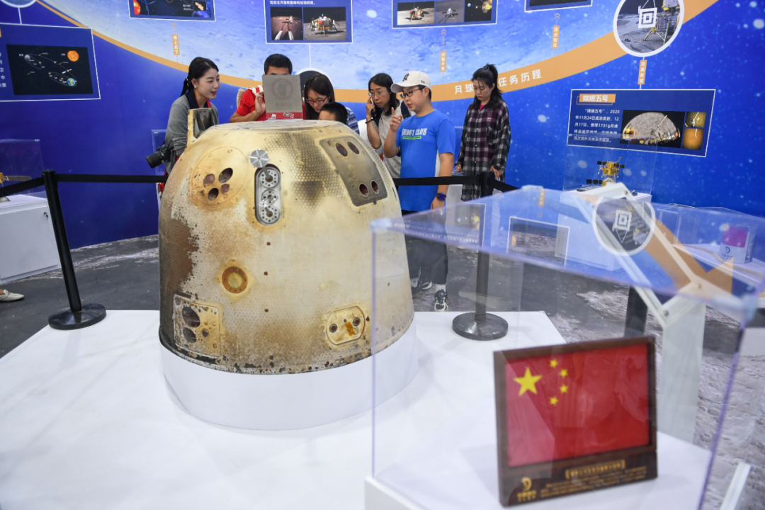 9月17日,在全国科普日北京主场活动展区,参观者参观展出的嫦娥五号再入返回飞行试验任务返回器。新华社记者鞠焕宗 摄从高海拔宇宙线观测站、人造太阳等国家重大科技基础设施,到“京华号”国产最大直径盾构机、“奋斗者”号载人潜水器等国之重器,行走在展馆中,科技发展的蓬勃气象扑面而来,向公众传递着实现高水平科技自立自强的创新自信。还原真实驾驶舱环境和操作流程,C919仿真机吸引观众排队体验、拍照打卡;坐进“太空舱”模拟太空旅行,体验航天电磁推进技术的未来应用;戴上VR眼镜,感受海洋油气核心装备的构成和安装……依托新技术、新手段加持的互动科普展品,让广大公众在沉浸式体验中深度感知前沿科技的力量。科技创新不仅面向世界科技前沿和国家重大需求,也在助推经济社会发展、服务百姓美好生活。