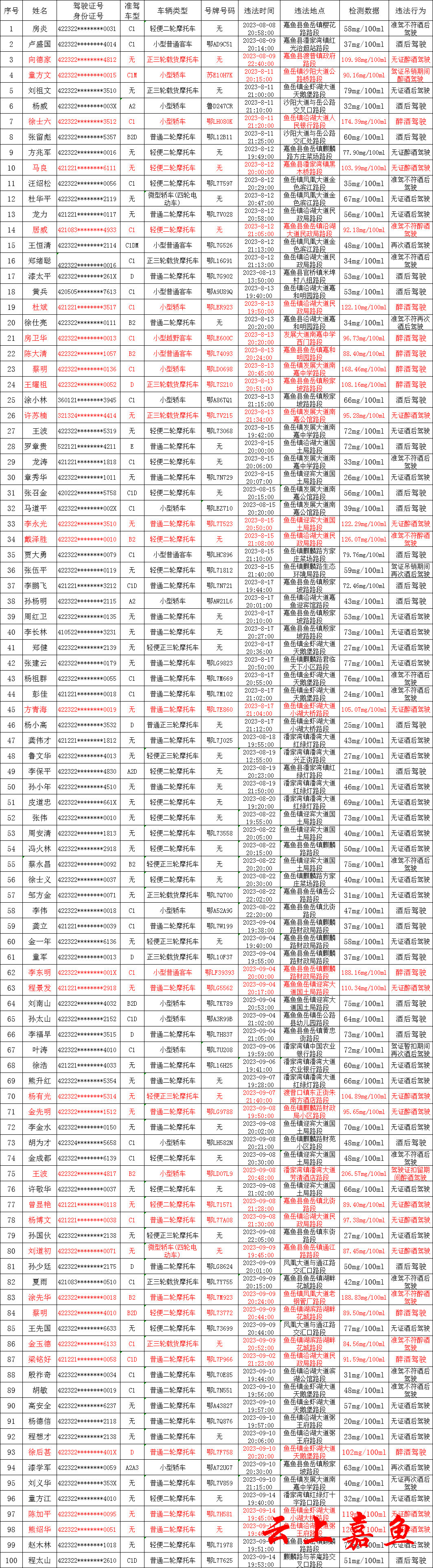 嘉鱼县公安局交警大队酒醉驾曝光台2023年第9期。下列人员因饮酒、醉酒后驾驶电动车、摩托车等机动车,构成违法和涉嫌犯罪行为被公安机关依法查处,被处以暂扣驾驶证6个月和吊销驾驶证,5年内不能重新申领等处罚。驾驶证暂扣和吊销期间不得驾驶机动车,望广大居民对下列人员进行监督,一旦发现下列违法人员有驾驶机动车行为的请立即向公安机关举报。对举报违法行为经公安机关查实的,给予举报人奖励500元。举报电话:0715-6351271。