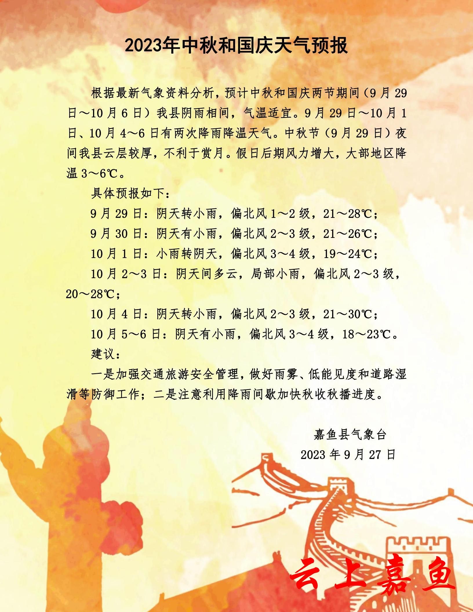 2023年中秋和国庆天气预报