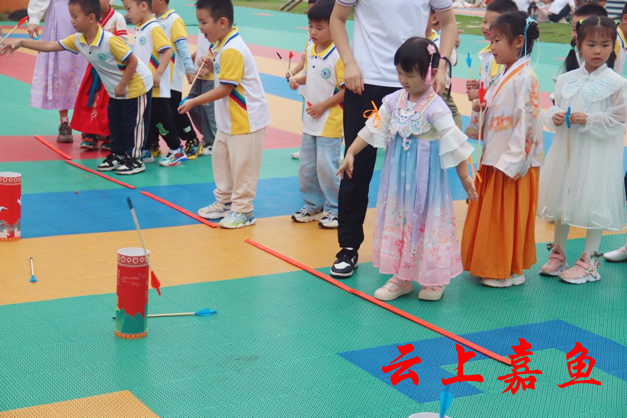 活动在舞曲《中秋》中正式拉开帷幕。随后,萌娃们在欢快的背景音乐下,个个神气十足、自信满满地开始T台走秀。幼儿园还组织了孩子们开展“翻滚吧兔子”“趣味投壶”等游戏,切实让文化自信的种子种在孩子们心中。