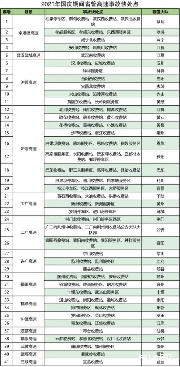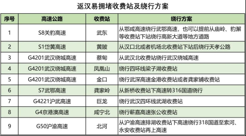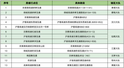 武汉绕城高速:花山收费站及互通、九龙互通附近、豹澥至凤凰山收费站附近;麻阳高速:武穴长江大桥至阳新东收费站之间减速车道;