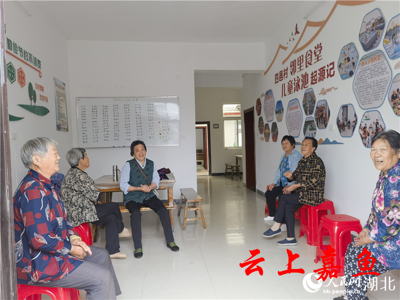 咸宁市嘉鱼县潘家湾镇四邑村里的“邻里食堂”里,老人们饭后聚在一起唱歌。人民网记者 周雯摄