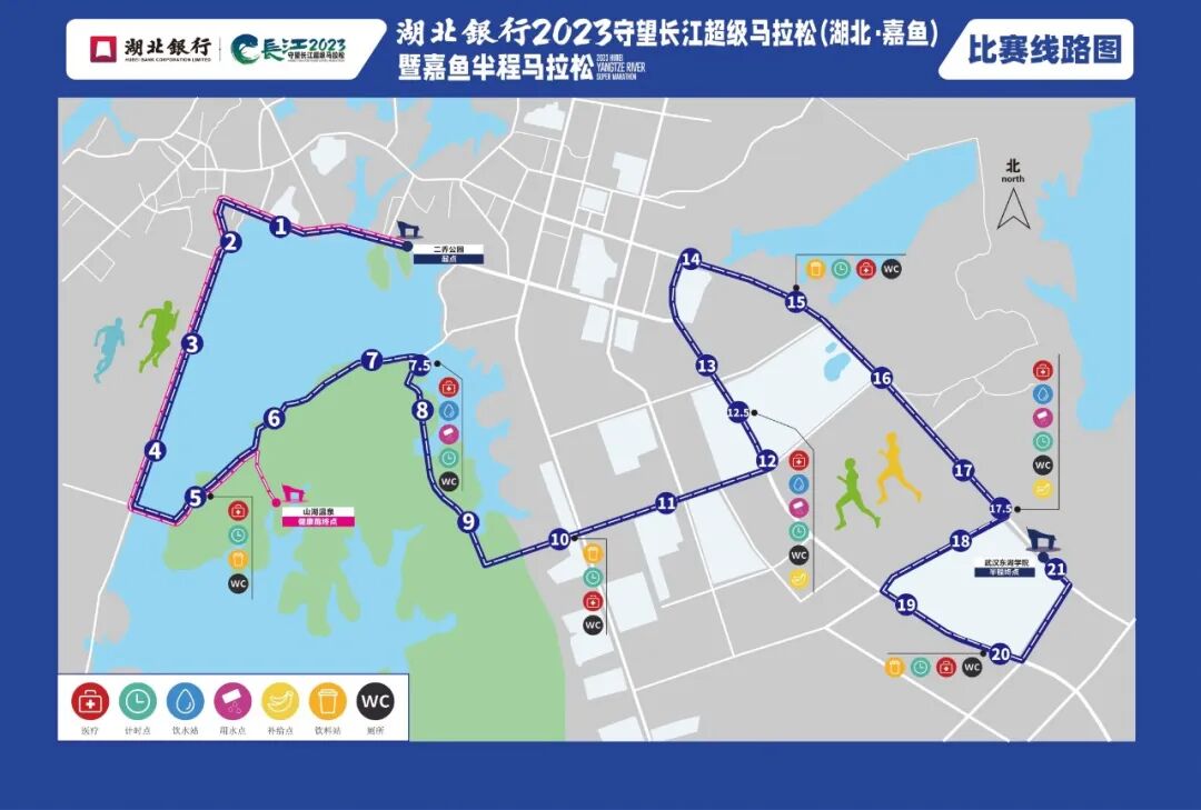 2023守望长江超级马拉松嘉鱼站赛道经过重新选定,起点仍为二乔公园,终点改为武汉东湖学院北门。赛道线路经过改进后,沿途风景更优美,赛道更平缓,终点广场更开阔,更利于参赛选手刷新PB!