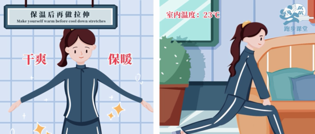冬跑穿太厚会影响跑步状态,但若不穿那么多直接出去跑又很容易着凉。因此,建议跑步前在室内充分进行15-20分钟的热身运动,如拉伸、原地跑等。此外,在室内进行一些核心力量的训练也会让跑步过程更加安全稳健,比如可以做平板支撑、仰卧起坐、俯卧撑等热身项目。等到体温有所提高之后,再穿着合适的衣物出去跑步。