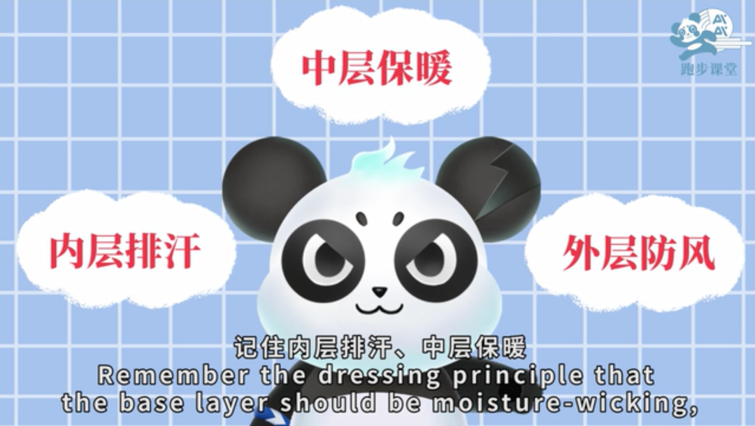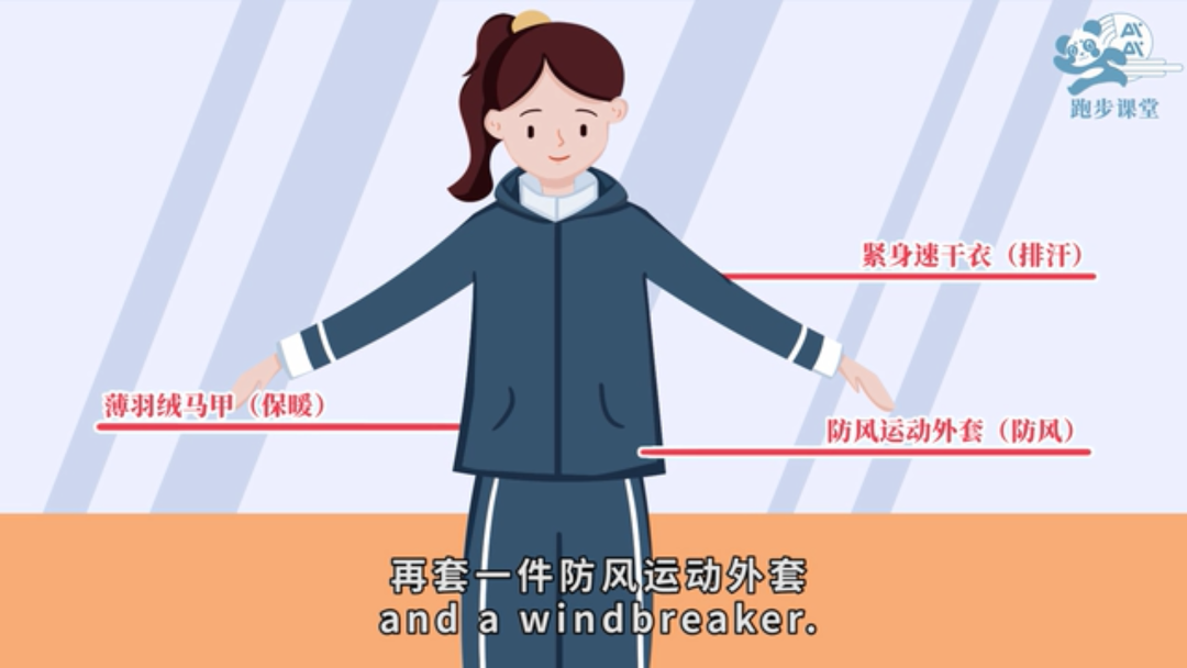 1.冬季户外跑步中的服装要兼顾排汗、保暖和防风防雨,常见穿衣方法为分3层:贴身层、中间层、最外层。