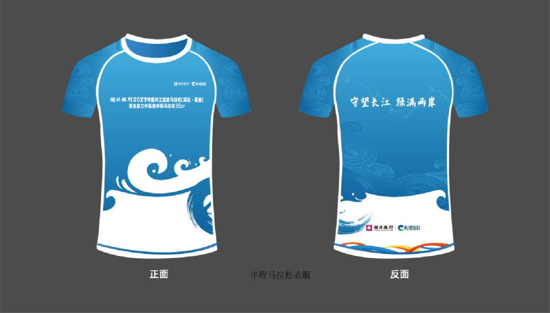 本次半程马拉松参赛服以蓝色为主要颜色,蓝色象征着水流,与本次马拉松“守望长江,绿满两岸”的赛事主题相呼应,蓝色也代表超越自我,奋力奔跑的无限活力。