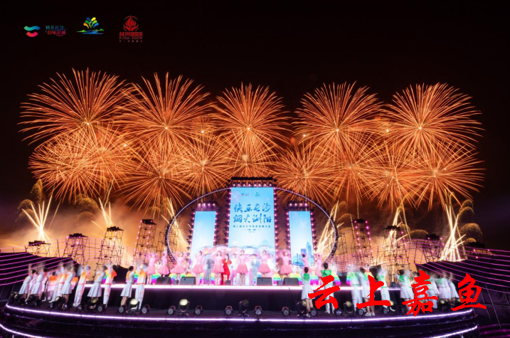 中国女高音歌唱家、国家一级演员陈思思领衔演唱《浏阳河》,九区县(市)文旅代表与现场观众同声共应,天幕焰火扑面而来,金色瀑布飞流直下,“万人同唱浏阳河”“九曲银河落九天”的互动场景拉开沸腾的序幕。