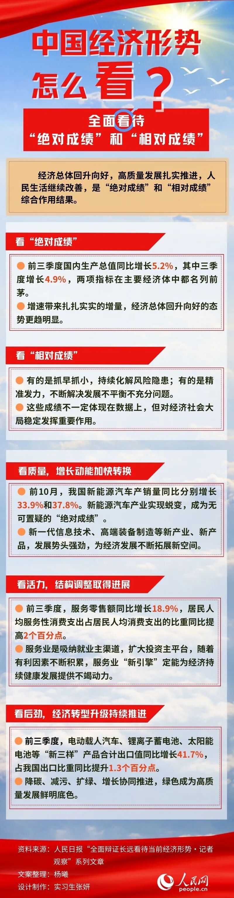今年以来,我国经济总体回升向好,高质量发展扎实推进。读懂中国经济,要看到成绩、坚定信心,也要正视问题、直面挑战。只有全面辩证长远看待,才能准确把握经济发展中的积极因素,形成推动高质量发展的强大动力。身处百年未有之大变局,把握优势、坚定前行信心,定能推动我国经济乘风破浪向前、迈上更高台阶。 来源:人民网