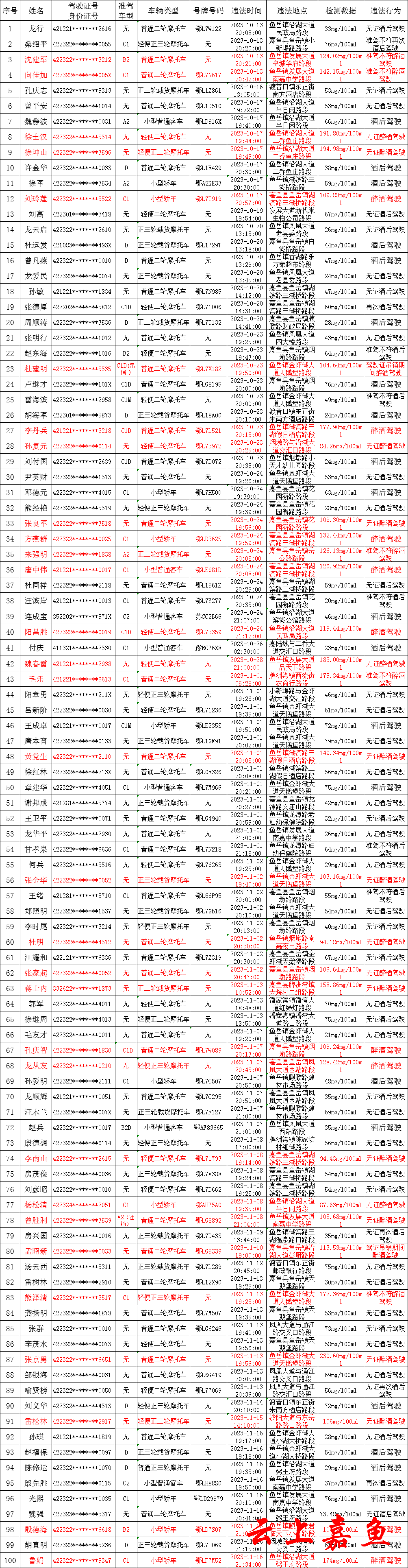 嘉鱼县公安局交警大队查处酒醉驾行动曝光台2023年第11期。下列人员因酒醉驾违法犯罪行为被公安机关依法查处,被处以暂扣驾驶证6个月和吊销驾驶证,5年内不能重新申领等处罚。驾驶证暂扣和吊销期间不得驾驶机动车,望广大居民对下列人员进行监督,一旦发现下列违法人员有驾驶机动车行为的请立即向公安机关举报。对举报违法行为经公安机关查实的,给予举报人奖励500元。举报电话:0715-6351271。