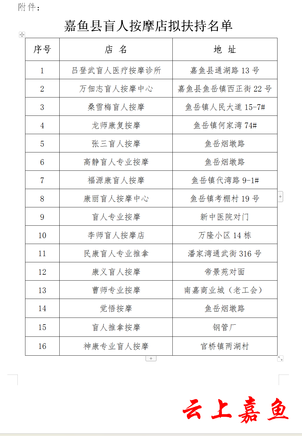 经县残联工作人员实地检查,现对2023年度符合盲人按摩店扶持条件,拟进行资金扶持的盲人按摩店名单进行公示(共16家,具体名单附后)。公示期为7天,从2023年11月30日起至2023年12月6日。