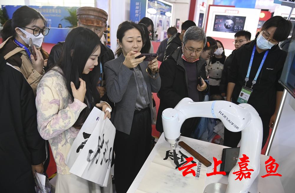 参观者在首届中国国际供应链促进博览会数字科技链展区科大讯飞展位观看一款AI书法机器人写毛笔字(2023年12月2日摄)。新华社记者 蔡湘鑫 摄