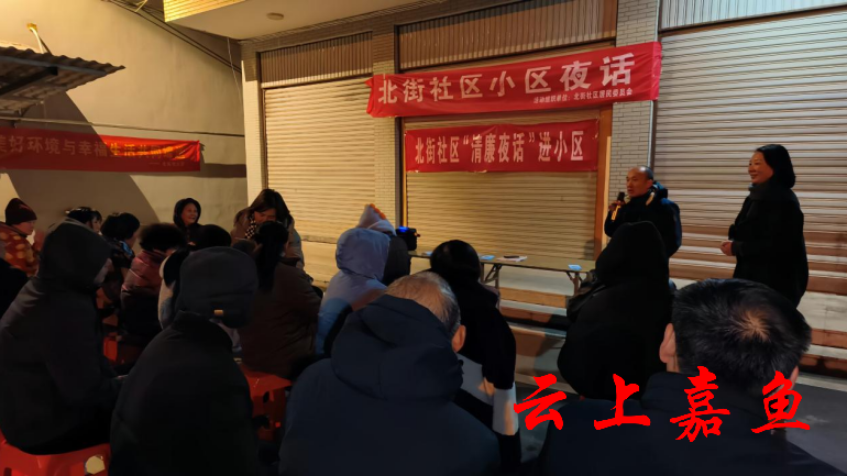 云上嘉鱼报道(全媒体记者郑洁)12月12日晚,北街社区在县融媒体中心小区院内开展“清廉夜话”主题活动,社区共建单位相关负责人、20余名辖区居民代表参加活动。
