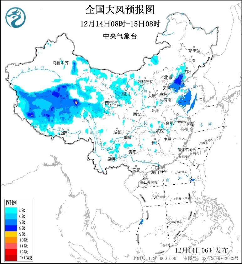 预计,12月14日08时至15日08时,新疆东部和南疆盆地、西藏西部、宁夏、青海、内蒙古中西部等地部分地区有5~6级、阵风7~8级的大风,其中,新疆山口地区、青海西部、西藏西北部等地部分地区有7~8级、阵风9~10级的大风;渤海、渤海海峡、黄海西部的部分海域将有7~8级、阵风9级的大风。