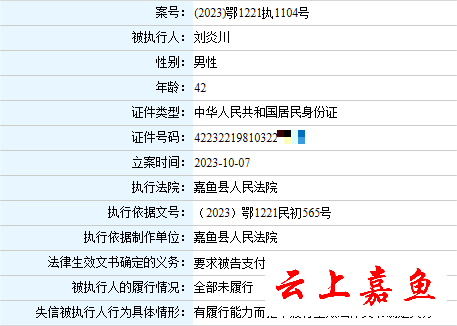 案例二:失信被执行人刘炎川,42岁,住湖北省嘉鱼县新街镇。