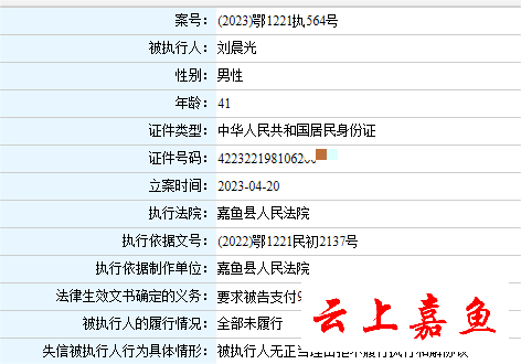 案例一:失信被执行人刘晨光,41岁,住嘉鱼县鱼岳镇。