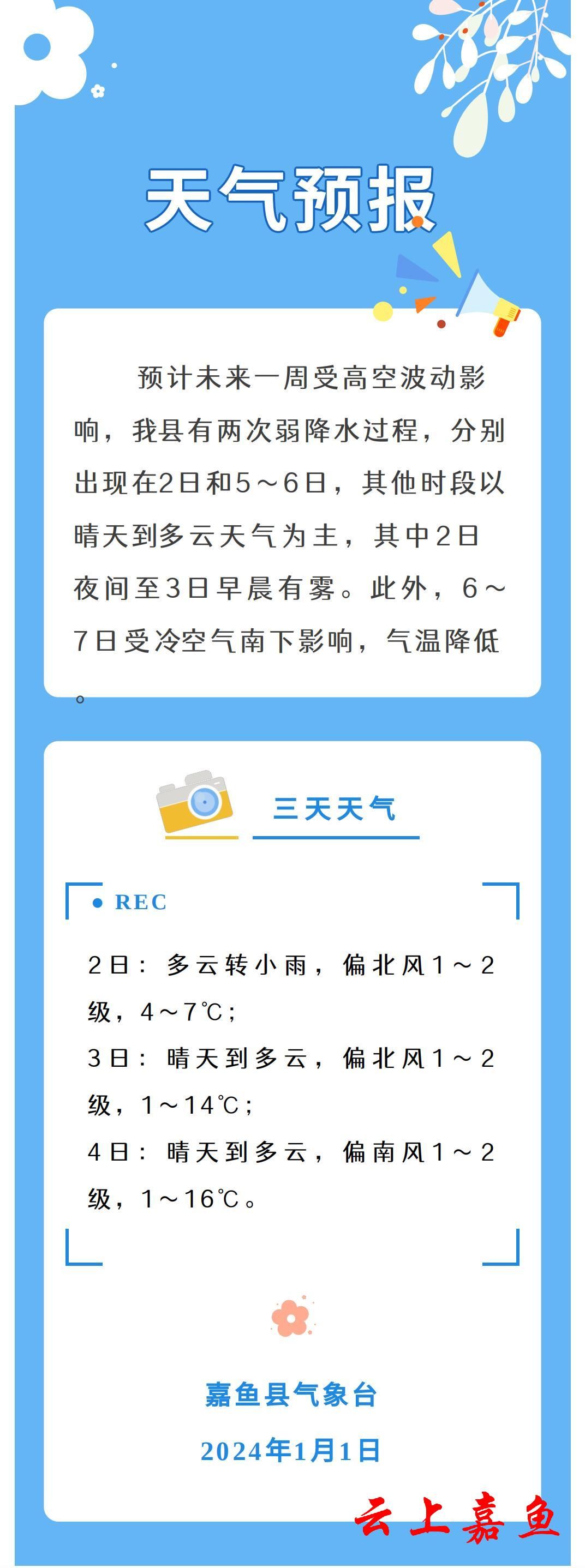 2024年1月1日嘉鱼天气预报