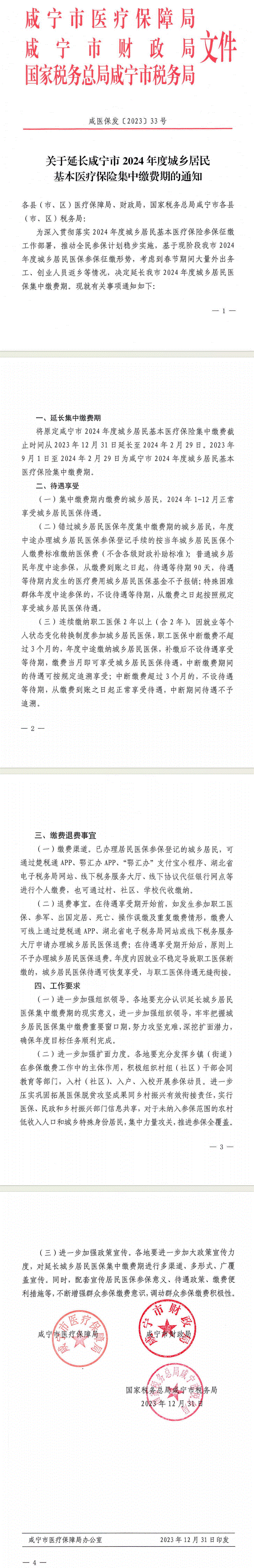 关于延长咸宁市2024年度城乡居民基本医疗保险集中缴费期的通知