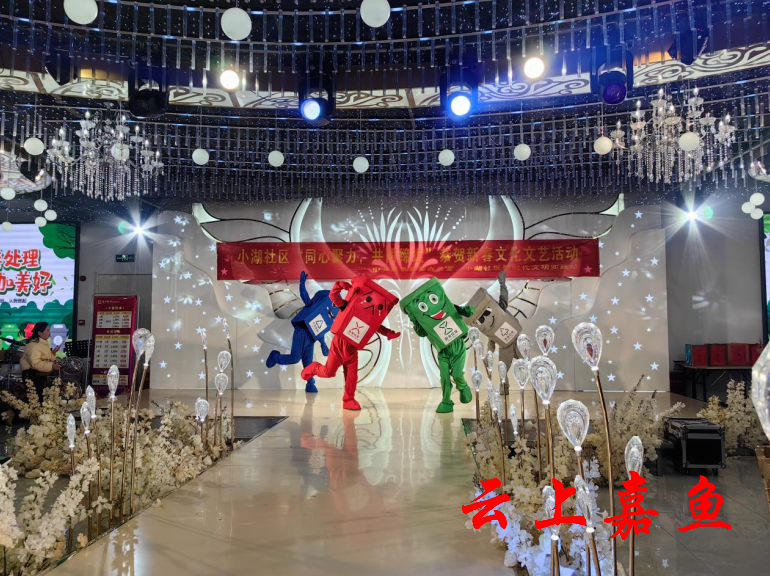 “垃圾分类是生活中的一种文明体现,大家生活中都注意垃圾分类吗?”随着主持人的介绍,来自云果(湖北)物联有限公司的四个“垃圾箱”人偶登上舞台。在大家的欢呼声中,演员们一边舞蹈一边宣传垃圾分类知识,欢快的节奏吸引了不少小朋友跟着起舞,大家在舞蹈中感受欢乐,学习垃圾分类知识。