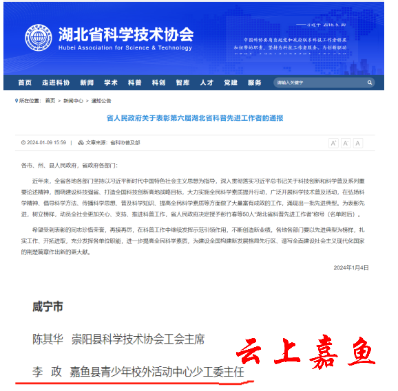 云上嘉鱼报道(全媒体记者熊琦)“作为一名教师,这都是我应该做的,也是我的梦想。”1月9日,第六届湖北省“科普先进工作者”名单出炉,嘉鱼县青少年校外活动中心少工委主任、新街镇中心学校副校长、湖北省青少年科技教育协会理事、嘉鱼县青少年科技教育协会理事长李政就是其中一名获奖者,面对荣誉,他有些腼腆。李政毕业于曲阜师范大学,来到嘉鱼县从事教学工作,如今已经有十几个年头。