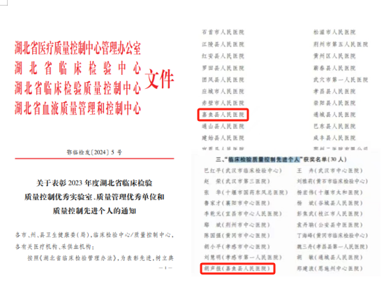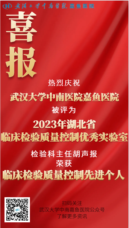 近日,经湖北省临床检验中心、湖北省临床检验质量控制中心对2023年度湖北省临床检验实验室、临床检验质量管理单位及质量控制人员进行综合评定,武汉大学中南医院嘉鱼医院从多家医疗机构中脱颖而出,被评为“2023年度湖北省临床检验质量控制优秀实验室”优秀单位,武汉大学中南医院嘉鱼医院检验科主任胡声报,从众多优秀专家教授中脱颖而出被评为“临床检验质量控制先进个人”为医院发展赢得新年首个“开门红”。这也是自武汉大学中南医院嘉鱼医院医学检验实验室开展此项评比活动以来,连续多年获此殊荣!