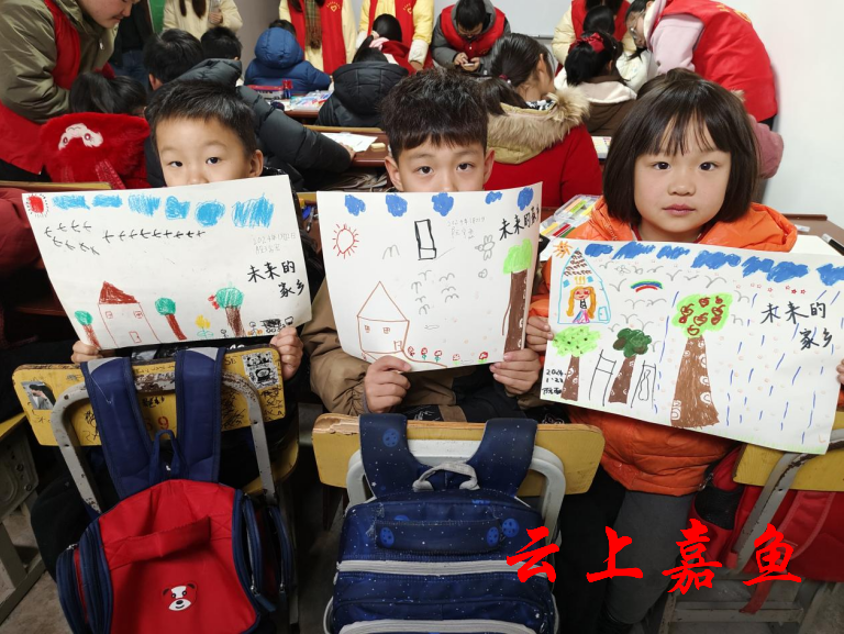 当天的特色课程是绘画,主题是画出未来家乡的样子。在志愿者们的引导下,孩子们充分发挥想象力和创造力,把脑海里的灵感尽情发挥到画纸上,蓝天、白云、绿树、房屋、小鸟……一幅幅画里蕴含着的是孩子们对家乡的美好祝愿。