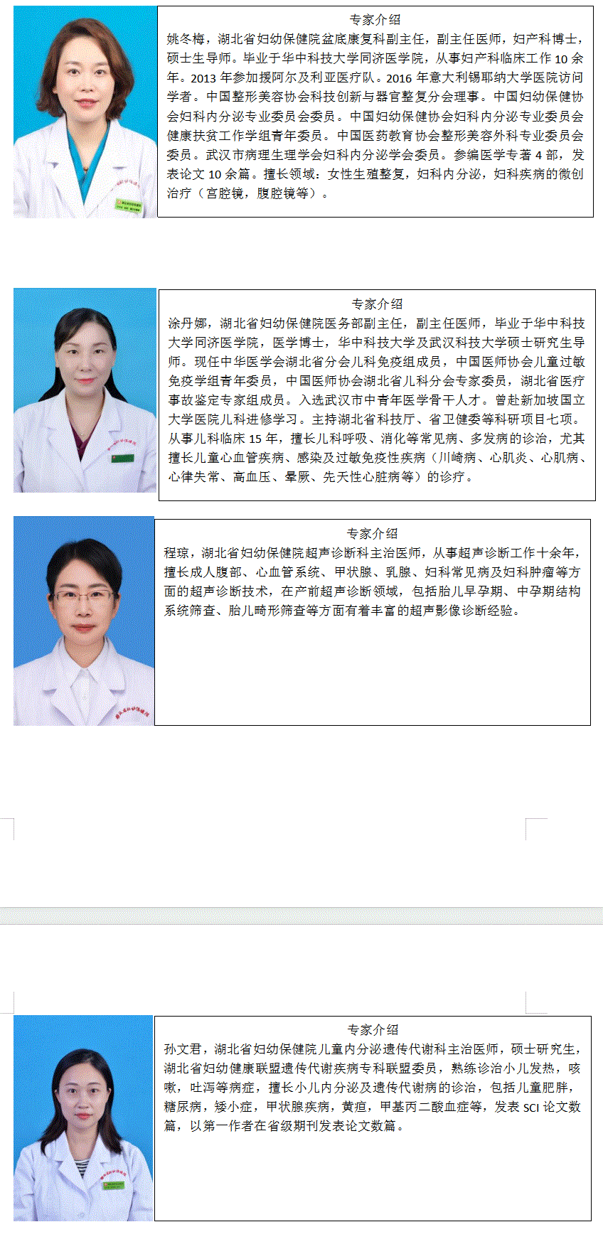 为方便广大患者在家门口就能享受省级医院专家坐诊,2024年1月26日(星期五),嘉鱼县妇幼保健院特邀湖北省妇幼保健院硕士生导师姚冬梅,湖北省妇幼保健院医学博士涂丹娜,湖北省妇幼保健院主治医师程琼,湖北省妇幼保健院硕士研究生主治医师孙文君,前来坐诊,热忱欢迎广大患者前来咨询。咨询电话:0715-6322826