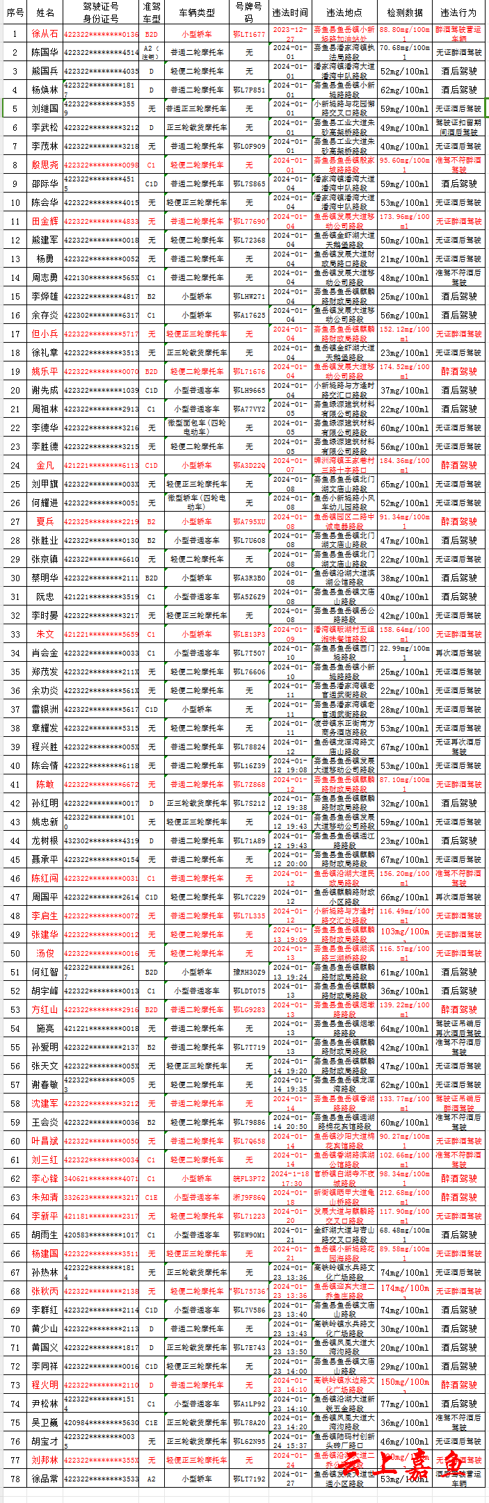 嘉鱼县公安局交警大队查处酒醉驾行动曝光台2024年第1期。下列人员因酒醉驾违法犯罪行为被公安机关依法查处,被处以暂扣驾驶证6个月和吊销驾驶证,5年内不能重新申领等处罚。驾驶证暂扣和吊销期间不得驾驶机动车,望广大居民对下列人员进行监督,一旦发现下列违法人员有驾驶机动车行为的请立即向公安机关举报。对举报违法行为经公安机关查实的,给予举报人奖励500元。举报电话:0715-6351271。