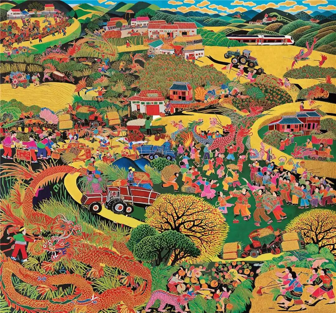 广大作者以木版年画、新年画、农民画以及具有年画元素的插画等多种艺术创作形式,描绘家乡的变化、丰收的喜悦和实现小康后的幸福生活,为生活上色,为幸福添彩,呈现出欣欣向荣的多彩画卷和奋发有为的精神风貌。甲辰龙年春节期间,为弘扬中华优秀传统文化,营造欢乐、祥和的节日氛围,恭贺新春佳节,此次 “新生活·新风尚·新年画”主题作品线上联展,精选来自全国各地的新年画作品,这些新年画色彩浓艳鲜明,手法精湛细腻,内容丰富,题材多样,兼具传统韵味与现代意义,为读者朋友们献上年味儿满满的文化盛宴和新春祝福。