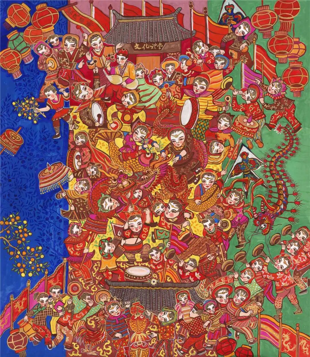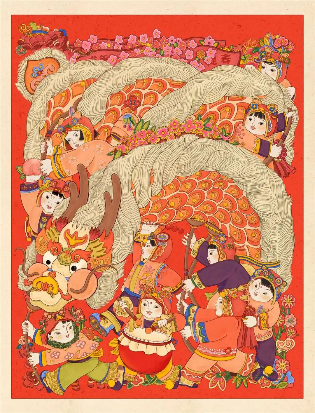 广大作者以木版年画、新年画、农民画以及具有年画元素的插画等多种艺术创作形式,描绘家乡的变化、丰收的喜悦和实现小康后的幸福生活,为生活上色,为幸福添彩,呈现出欣欣向荣的多彩画卷和奋发有为的精神风貌。甲辰龙年春节期间,为弘扬中华优秀传统文化,营造欢乐、祥和的节日氛围,恭贺新春佳节,此次 “新生活·新风尚·新年画”主题作品线上联展,精选来自全国各地的新年画作品,这些新年画色彩浓艳鲜明,手法精湛细腻,内容丰富,题材多样,兼具传统韵味与现代意义,为读者朋友们献上年味儿满满的文化盛宴和新春祝福。