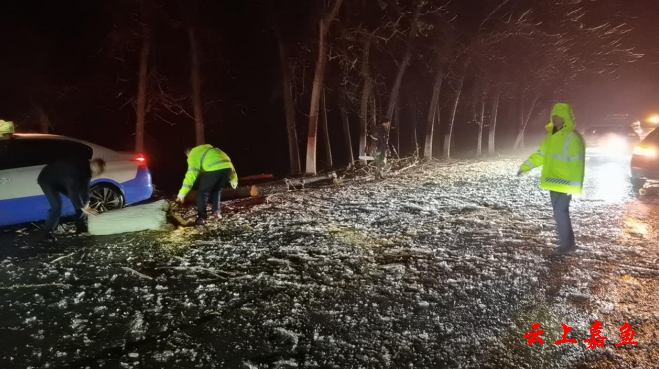 簰洲湾镇路面结冰湿滑,沿路被雪压断散落的树枝在表面覆盖了冰层后变得光滑且尖锐,对通行车辆和行人安全有着极大威胁,派出所值班人员迅速出动警力破冰除障,防止安全事故发生。