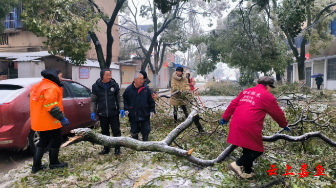 在辖区各个路段,大家逐一清理残枝、敲落积雪,支撑起倒落的树木,并对已经损坏尚未完全折断的树木枝干进行截断处理,及时将大雪压弯压断的树枝进行修剪、装车、清理现场,恢复道路通畅。