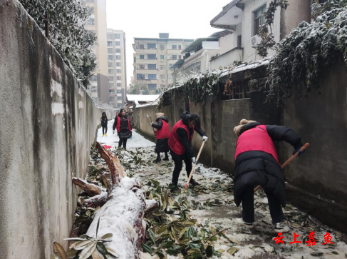 在社区各网格,社区工作人员联合小区物业、热心居民拿着铁锹、扫帚,齐心协力,全力开展清理树枝、铲雪除冰工作,很快清理出了一条条道路。