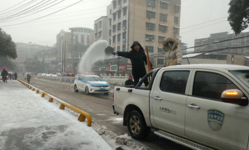 为了做到快速、准确除冰,环卫工人和城管大队加强路面巡查,对易结冰路段做到心中有数,不仅提高工作效率,同时也将安全事故降至最低。在城区沙阳大道、沿湖大道等城区交通要道,环卫工人和执法队员迎着寒风,挥舞着手中的铁锹,一遍遍抛撒食盐。挥起的每一个动作、撒下的每一铲盐,彰显了城管人的担当和责任。