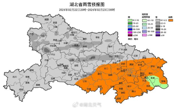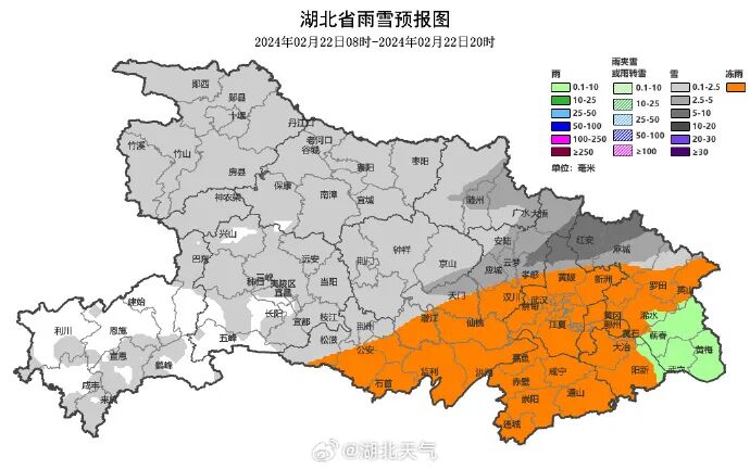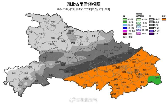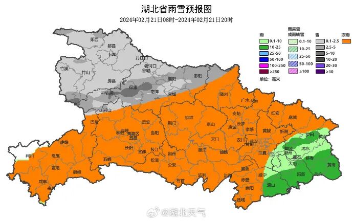 21日08时-22日08时,十堰、襄阳、神农架、随州西部阴天有中到大雪;宜昌、恩施北部、荆门、随州东部、孝感、荆州、天门、潜江、仙桃、武汉西部阴天有冻雨或冰粒;其他地区阴天有小到中雨,山区有冻雨或冰粒。最高气温北部-2~1℃、南部2~6℃,最低气温恩施地区0~2℃、其他地区-5~-1℃。偏北风4到6级、阵风7到10级。