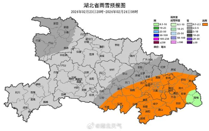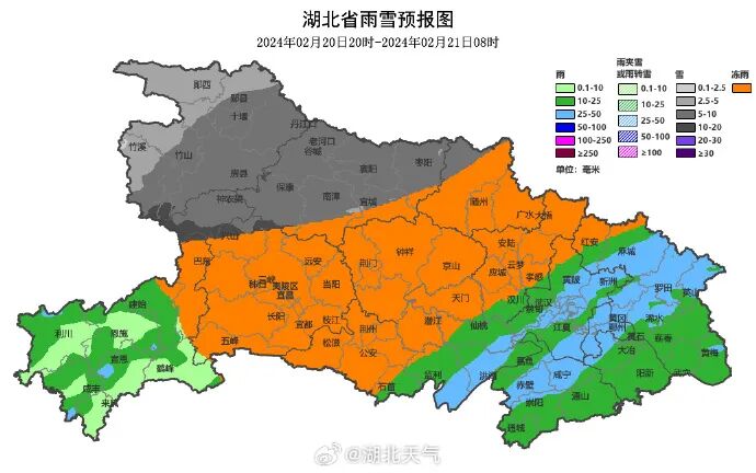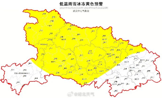 低温雨雪冰冻黄色预警武汉中心气象台02月20日14时发布低温雨雪冰冻黄色预警:预计2月20日20时至21日20时,十堰、襄阳、神农架、恩施北部、宜昌、荆门、荆州、天门、潜江、仙桃、随州、孝感、武汉西部、黄冈西部有冻雨、冰粒或雪,最低气温≤0℃,请注意防范。