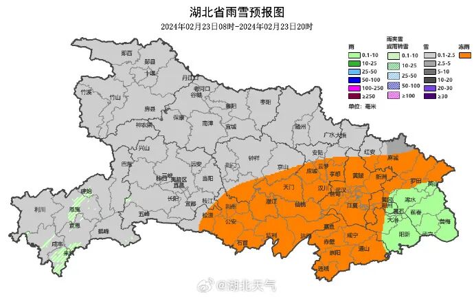 23日08时-24日08时,荆州、天门、潜江、仙桃、武汉、黄冈、鄂州、黄石、咸宁阴天有冻雨或冰粒,其他地区小到中雪、局地大雪。最高气温恩施地区1~4℃、其他地区-2~1℃,最低气温北部-6~-3℃、南部-3~0℃。偏北风3到4级、阵风5到6级。