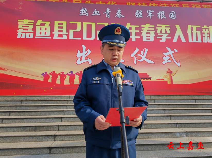 县委常委、县人武部政委张伟对新兵提出殷切期望,期望新兵长怀报国之志,忠诚担当,展示出无私无畏的爱国热情和勇于担当的博大胸怀,用勤劳的双手托起祖国坚强的钢铁长城、保卫祖国的繁荣与人民的幸福安康;期望新兵苦练军事本领,服从命令,用敢打必胜的豪气、舍我其谁的勇气、赴汤蹈火的胆气,为强国梦、强军梦奉献自己的青春力量;期望新兵敢于磨砺拼搏,争创功绩,牢固树立热爱军队、献身国防的坚定信念,争取早立新功、早创佳绩、早传捷报,为嘉鱼人民争光,给家乡父老添彩。