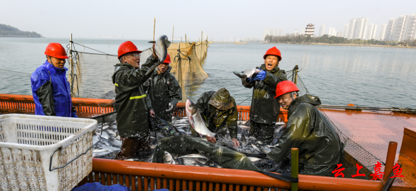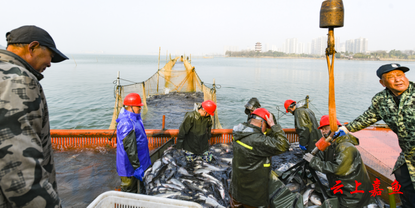 云上嘉鱼报道(全媒体记者雷平 通讯员王子卿)3月15日,嘉鱼县三湖连江梅懈湖热闹非凡,嘉鱼县南江水产有限责任公司正组织捕捞人员赶网捕捞,成鱼将直销湖北浔味堂食品有限公司,经深加工后,销往全国各地。