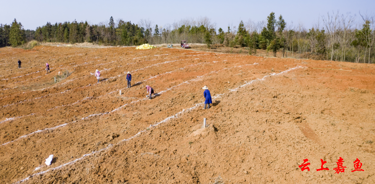 云上嘉鱼报道(全媒体记者雷平 通讯员马心如 唐浩然)3月15日,在高铁岭镇八斗角村香柚种植基地,嘉鱼县乐丰果业发展有限公司正在组织人员使用挖机开垦荒山,扩种香柚,现场呈现一片繁忙景象。