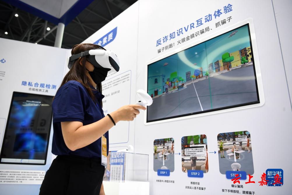 一家参展企业代表在2022年国家网络安全宣传周网络安全博览会上演示反诈知识VR互动体验项目(2022年9月4日摄)。新华社记者 刘军喜 摄